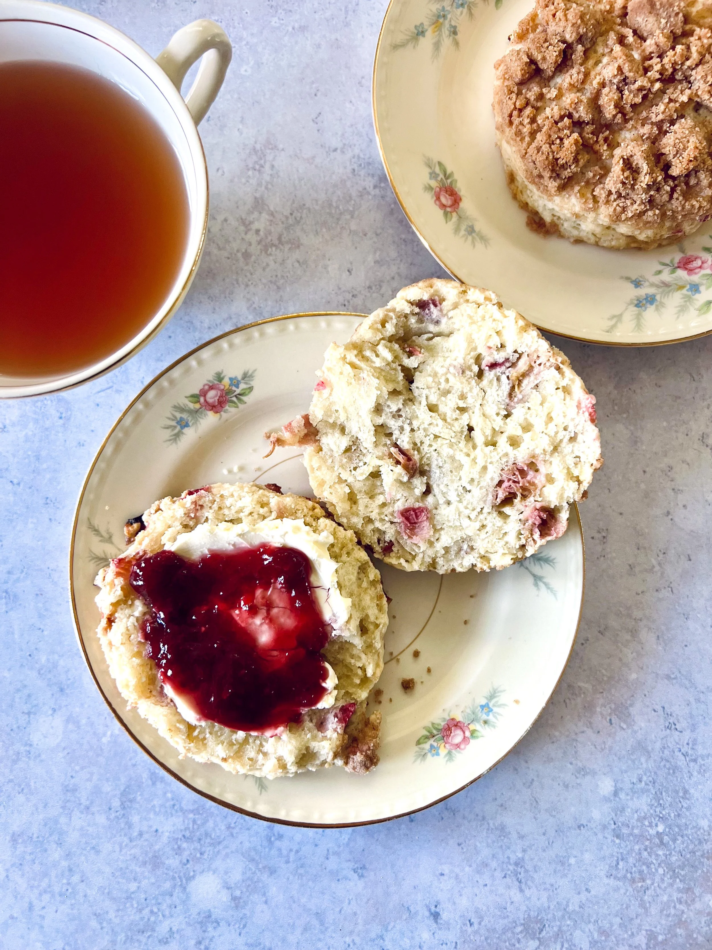 I could not think of a more suitable recipe for a regency romance than a tea time scone. These Rhubarb Crumble Scones are just as untraditional as the characters themselves and fit their personalities perfectly. The sweet crumble topping balances out the tartness of the rhubarb, just like Dora’s quiet sweetness helps to calm Elias’s sour moods.