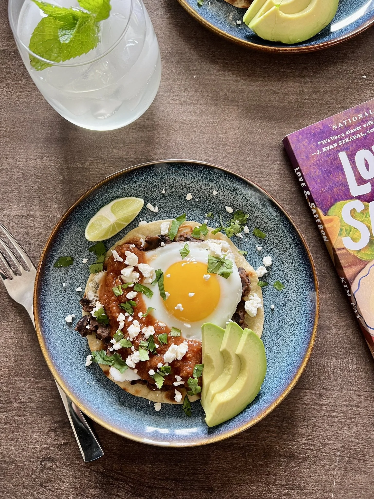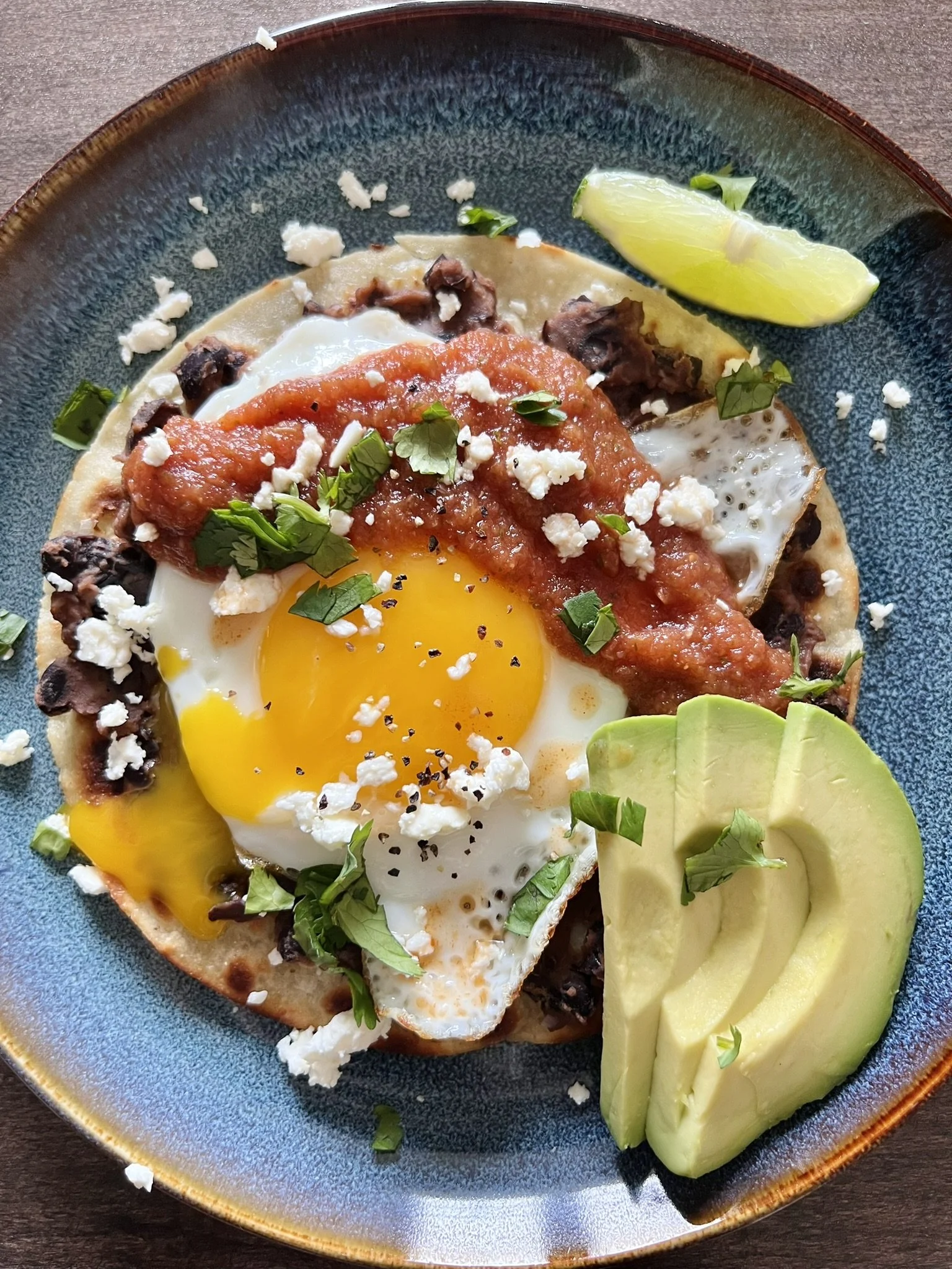 To serve, spread a bit of the refried beans onto a crisp tortilla, top with a sunny-side up egg, a good spoonful of ranchero sauce, and garnish with sliced avocado, cilantro, cotija cheese (or feta, if it’s not available to you), and a drizzle of hot sauce, if you like. This should make enough for about 6 servings.
