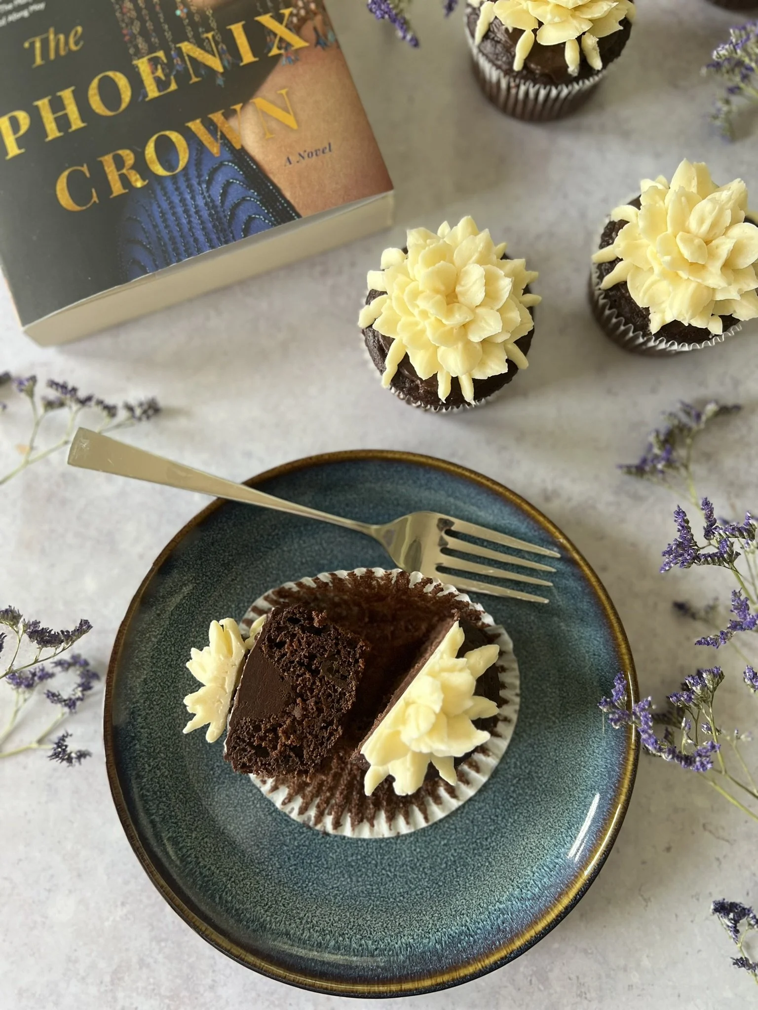My inspiration for this month’s recipe is the Queen of the Night flower. It holds great significance throughout the book - bonding the women together in a friendship born from shared hardship and trauma. I chose to make a light and airy chocolate cupcake to represent the dark times they travelled through, made a little lighter by their being there for each other. A filling of raspberry ganache represents the blood shed at these integral points in time, and a white flower to show how these connections can bring us back to a place of wonder and hope.